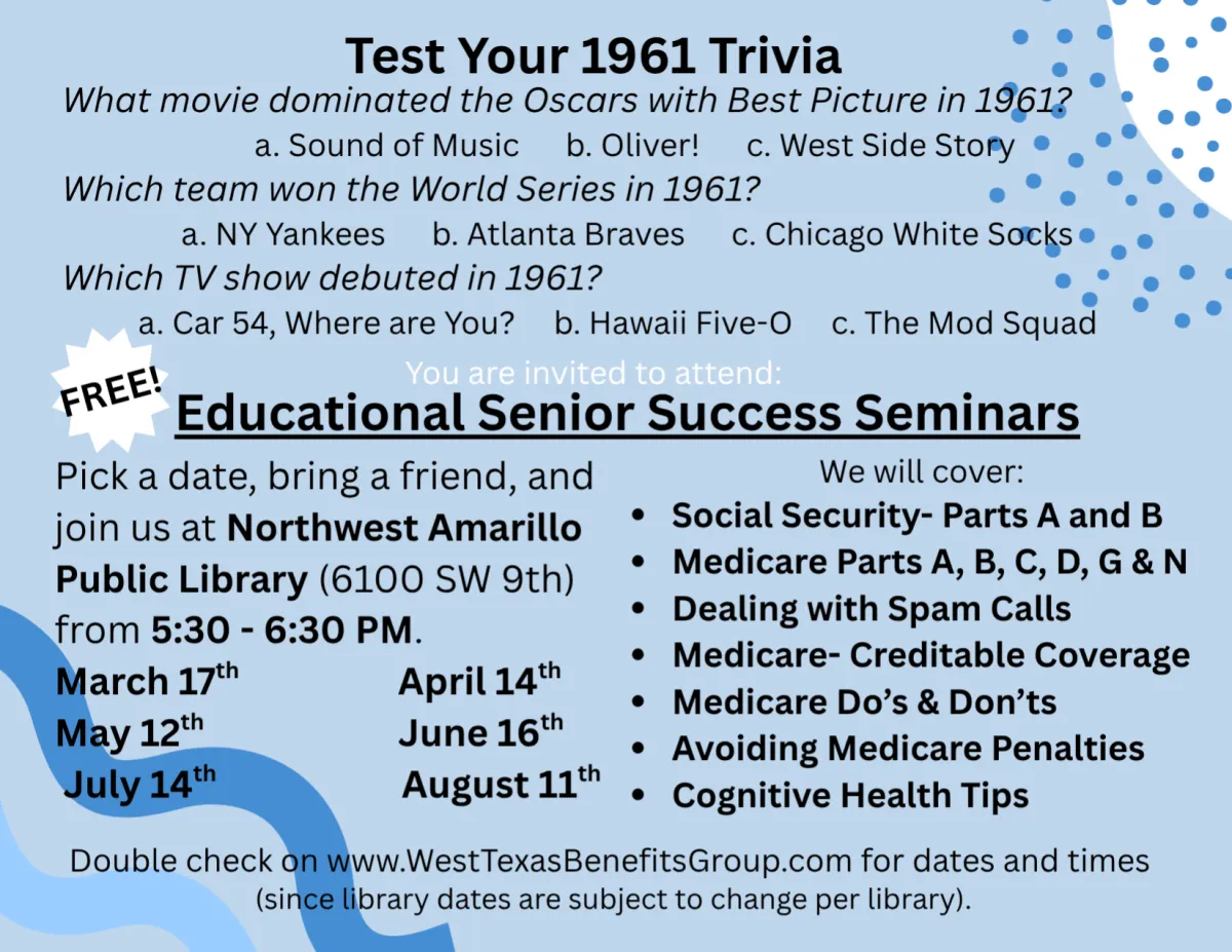 Our Educational Senior Success Seminar events will help you find the best plans to expand your coverage, save money, and get peace of mind before 2026 Open Enrollment. These events are completely free to attend.